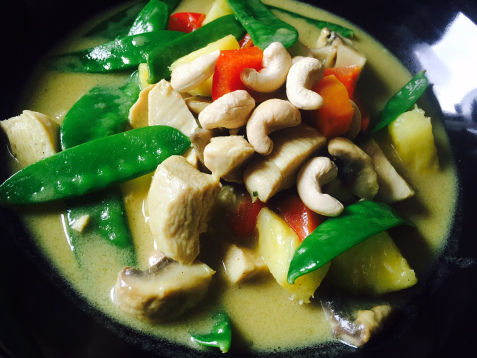 Die Kokosmilch mit der Currypaste in einen Wok oder eine Pfanne geben. Anschließend das Fleisch dazugeben, dann das Gemüse, die Zuckerschoten und die Ananas erst, wenn die anderen Gemüsesorten die gewünschte Bissfestigkeit erreicht haben. Grundsätzlich sollte man Gemüse mit einer kurzen Garzeit zum Ende hinzufügen, bzw. die Reihenfolge der Zugabe nach der Garzeit richten.