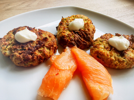 Die Zucchini raspeln und in Salz einlegen (ca. 10-15 Minuten) danach auswringen und abtropfen. Die Zucchini mit dann mit dem Ei, Parmesan, Gouda, der Zwiebel, Weizenkleie und Mandelmehl vermengen. Die Masse mit Salz und Pfeffer abschmecken.